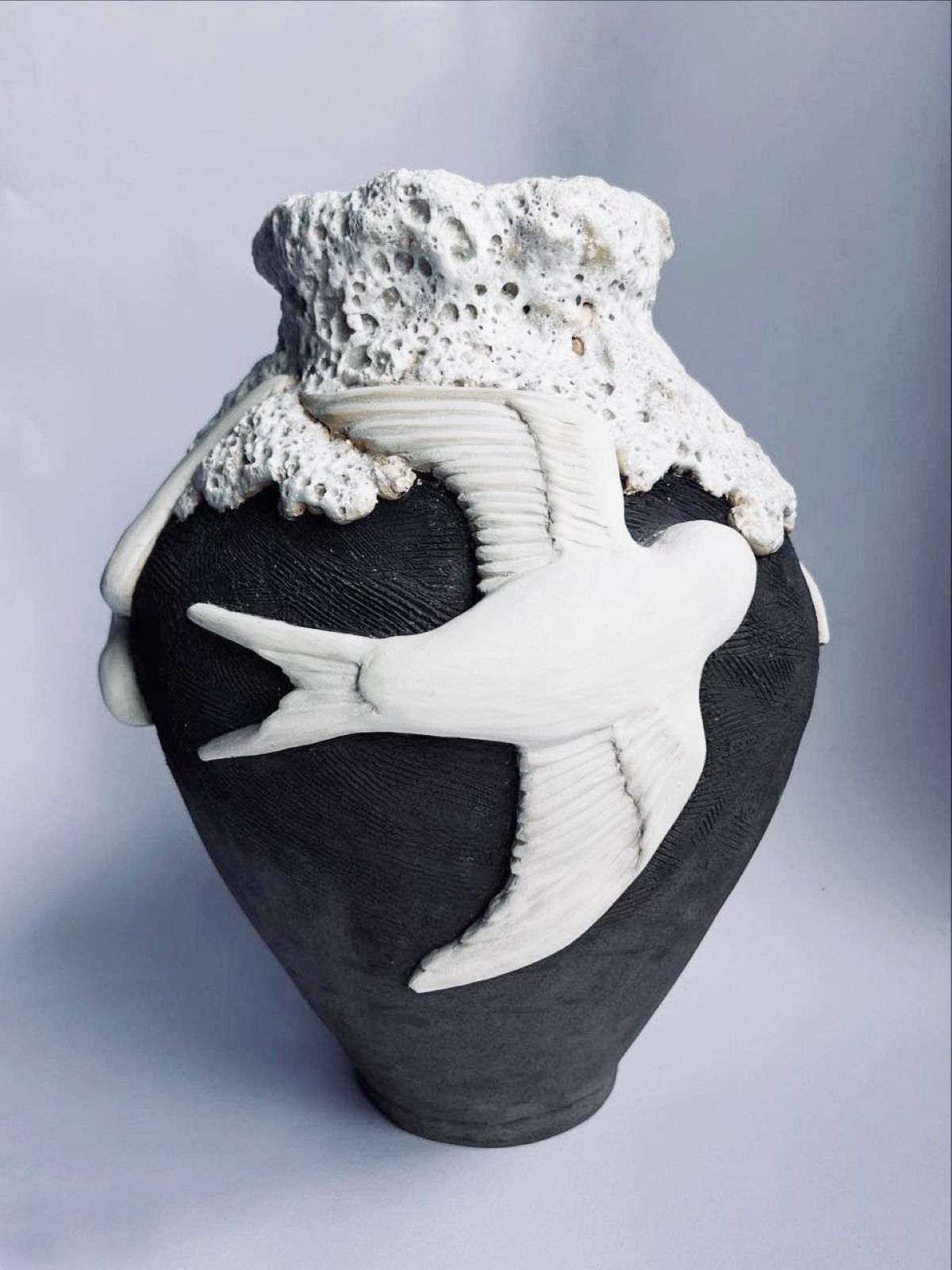 Форма вазы соединяет противоположности: чёрное и белое, гладкое и пористое, плотное и хрупкое. Контраст фактур воплощает внутреннее сопротивление, желание сохранить индивидуальность в мире, где всё стремится к унификации.