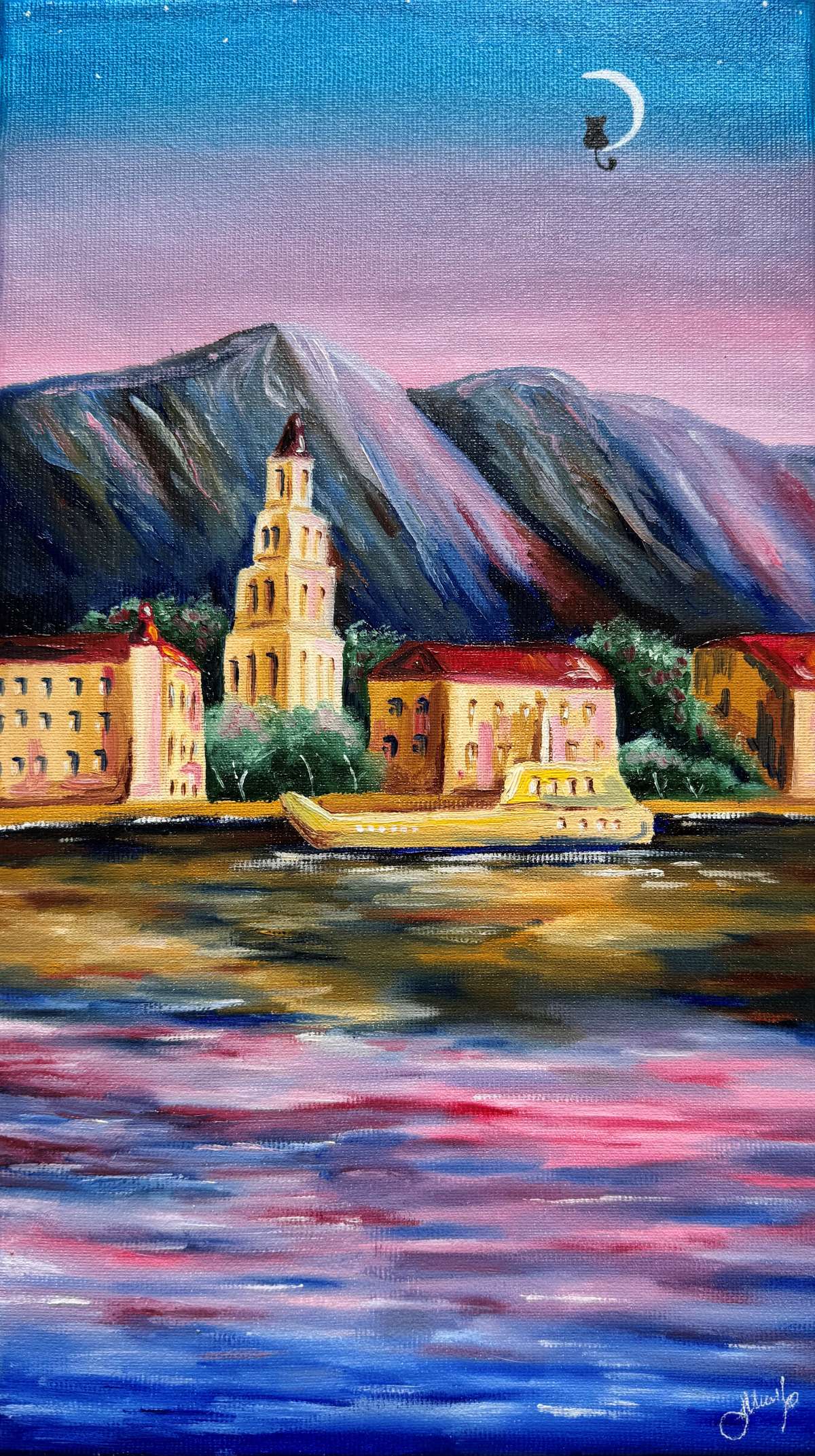 На первый взгляд — это спокойный вечерний город, отражённый в воде, где всё кажется упорядоченным и неподвижным. Но в небе, над горами и домами, сидит кошка на тонком серпе луны — маленький символ внутренней свободы.