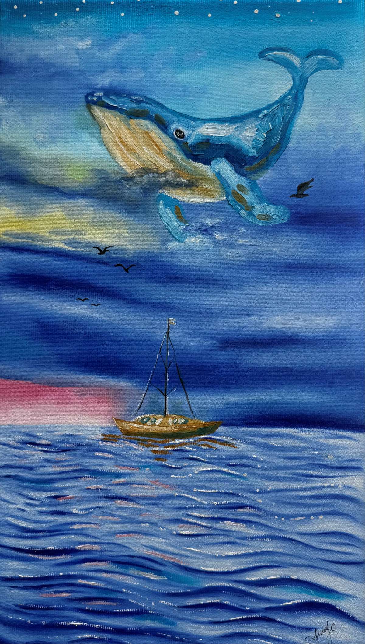 Кит, покинувший глубины моря, парит в небе над небольшим кораблём.