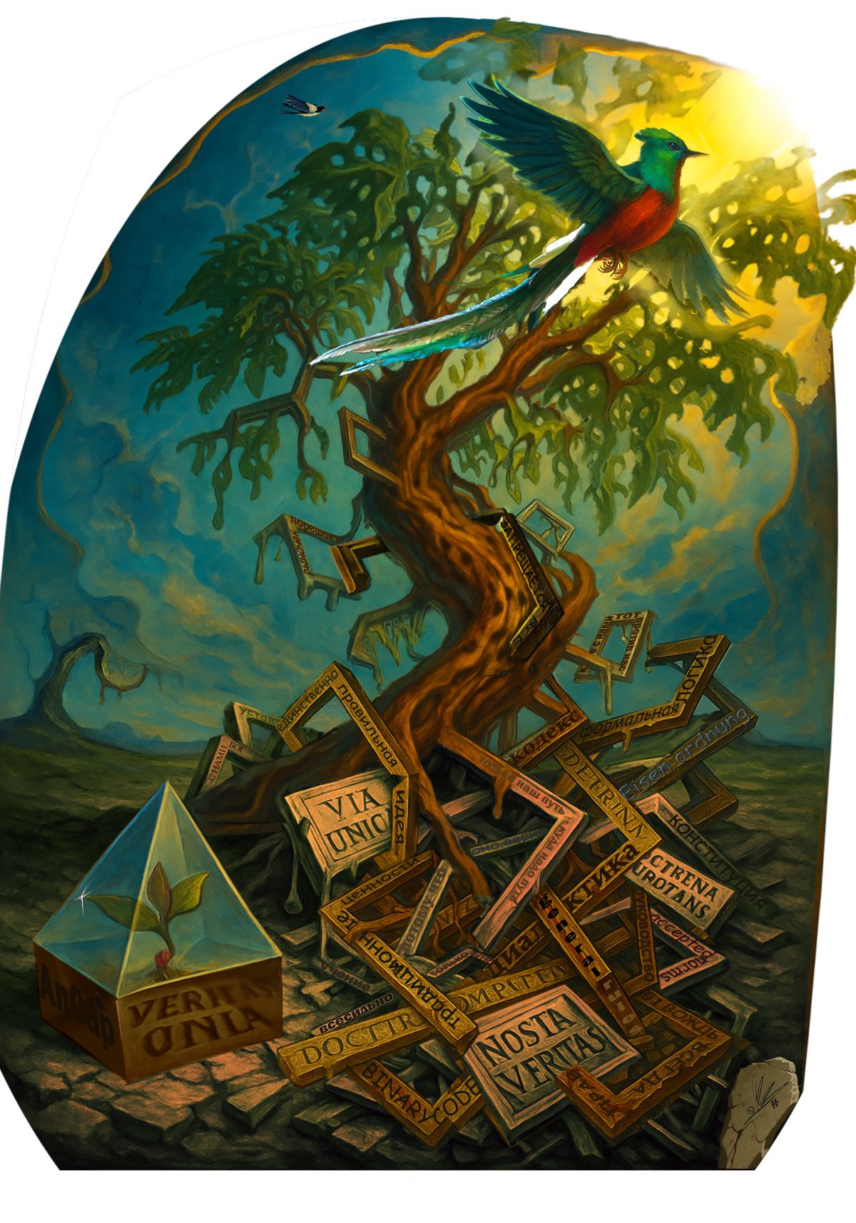 Центральный образ — дерево, прорвавшееся из кристаллической пирамиды сквозь сломанные идеологемы, догмы, концепты и прочие «единственно верные пути». Это живая метафора свободы и воли к жизни как органического, неуправляемого, но гармоничного процесса.